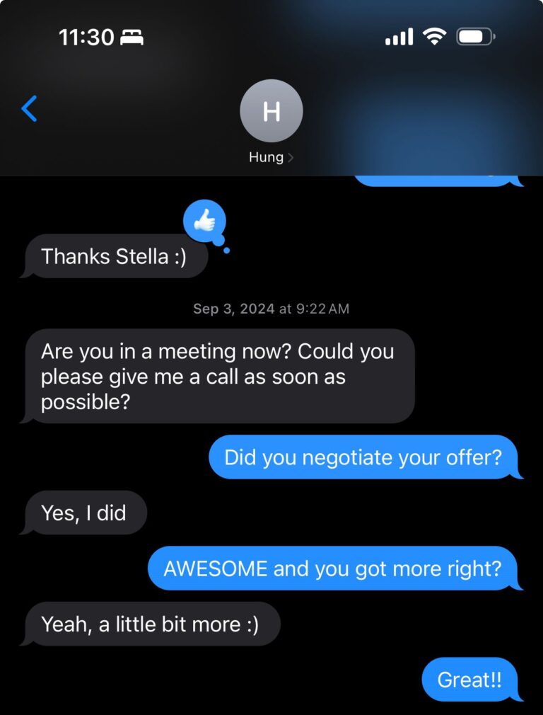 My name is Hung Truong, and I’m a software engineer with over a decade of experience in full-stack web development. After being laid off in April 2024, I began actively searching for new opportunities and realized I needed to refresh my approach. That’s when I reached out to Stella, who supported me with resume advice, introduction revisions, and in-person interview preparation.