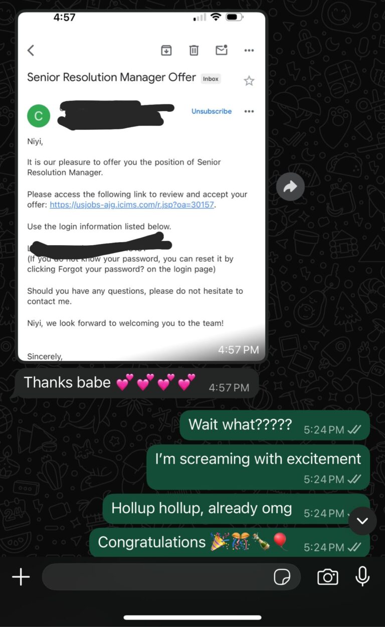 I can’t recommend Stella highly enough! She worked wonders on my resume, and within just one week of her expert touch, I landed a new job. The moment you sign up with her, she’s on you and stays on you, always thinking about you, checking in regularly, and sending reminders to make sure you’ve completed your part. Stella is incredibly disciplined and doesn’t play around when it comes to helping you succeed.